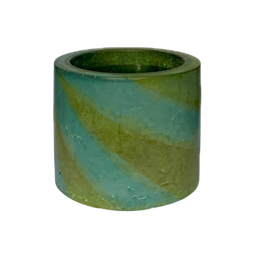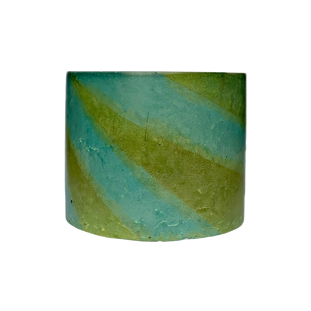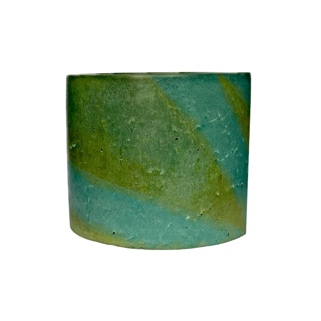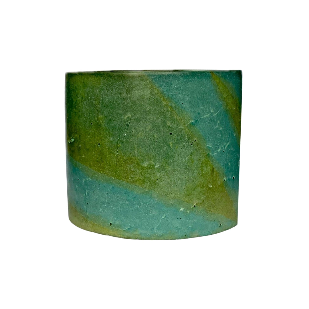 Handcrafted from cement and stained with copper and iron, this vessel has a striking blend of olive green and electric blue patinas.