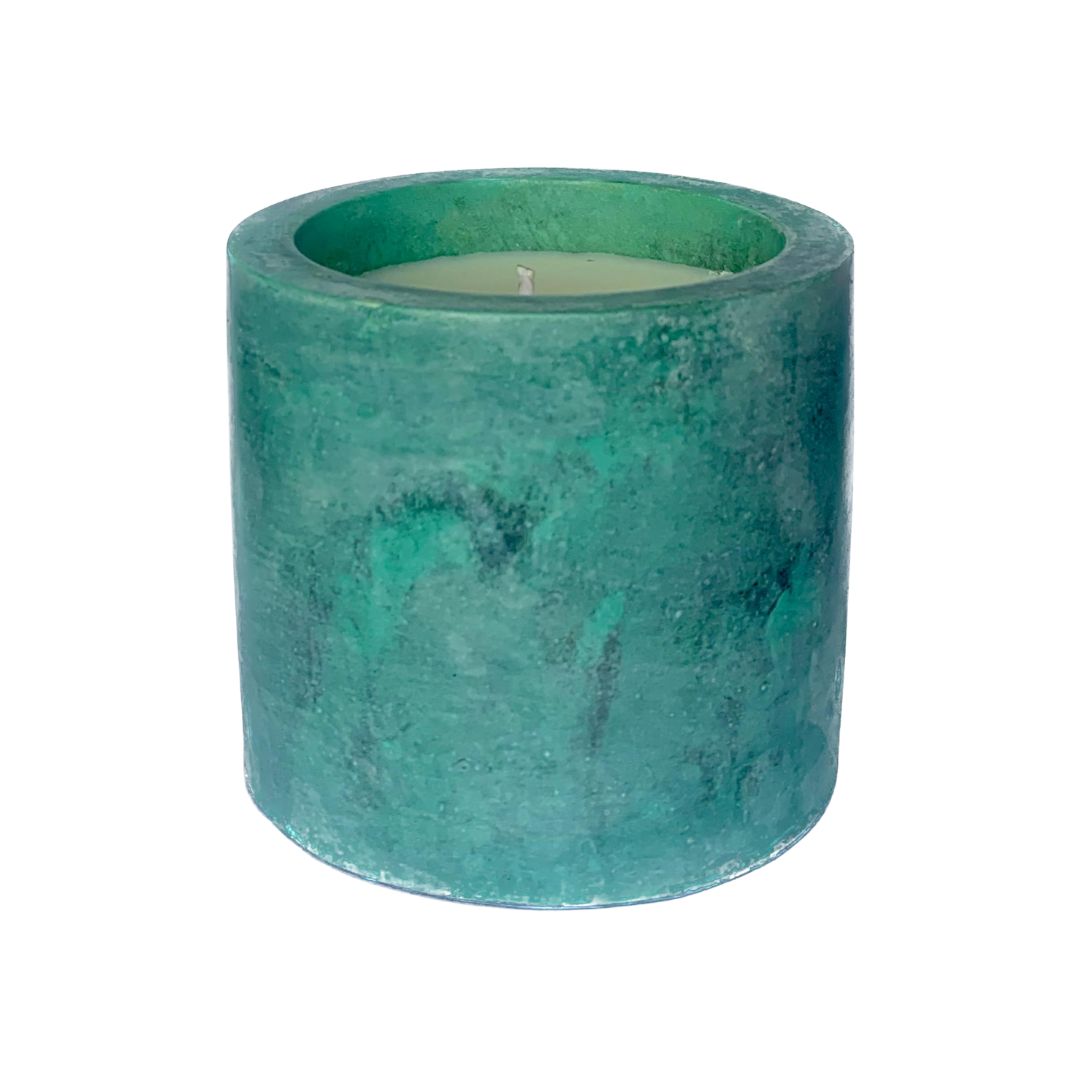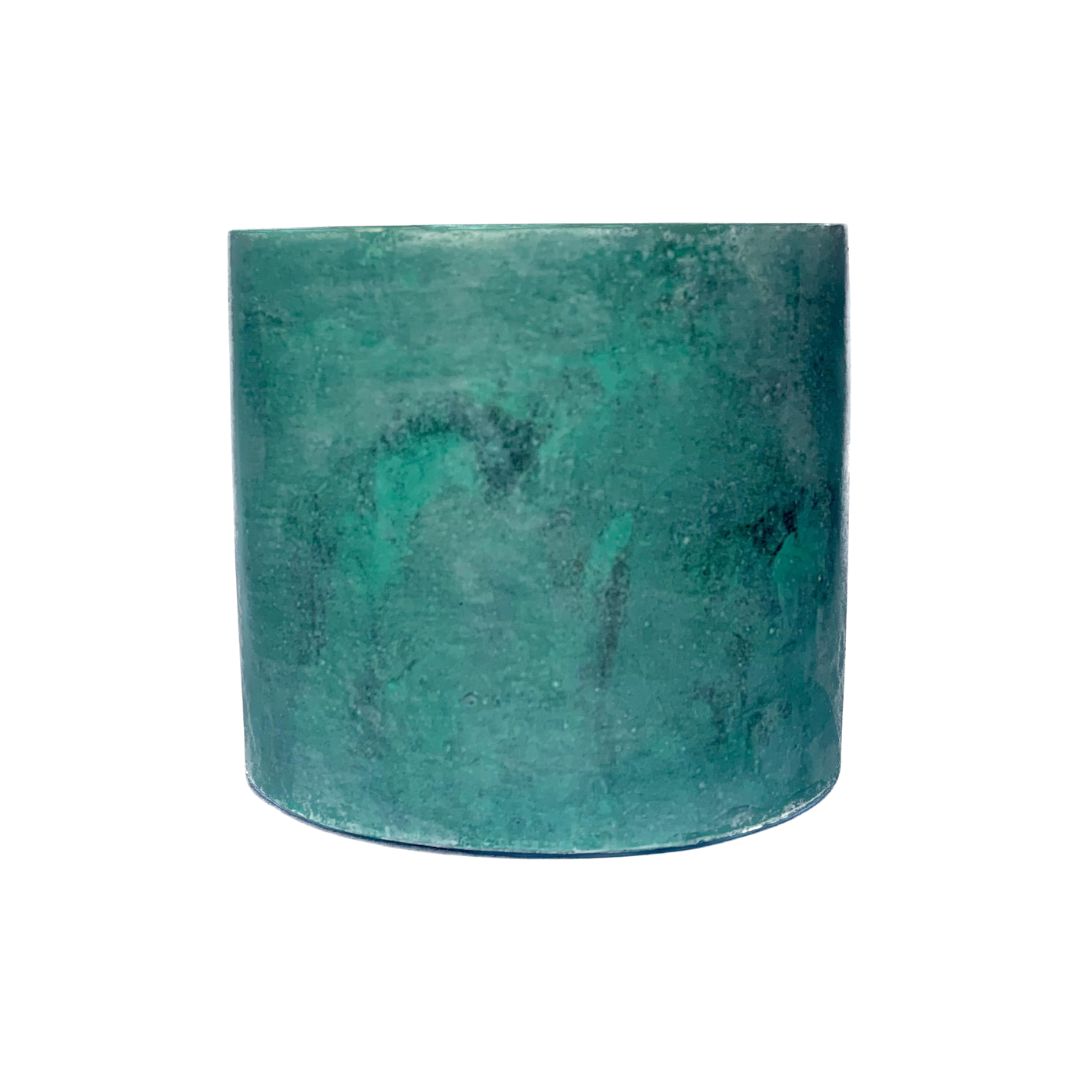 A handcrafted cement vessel stained with copper to reveal a striking deep blue and black patina.