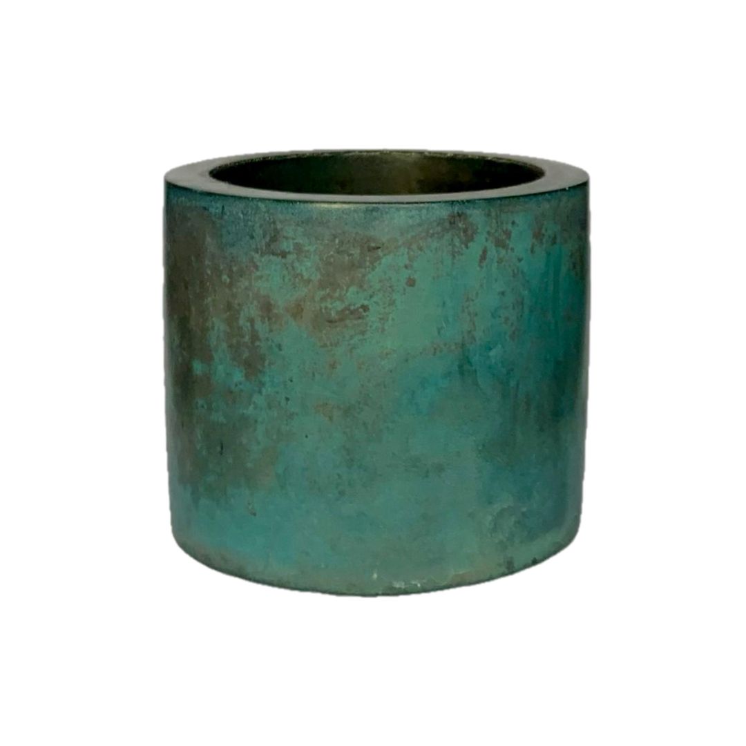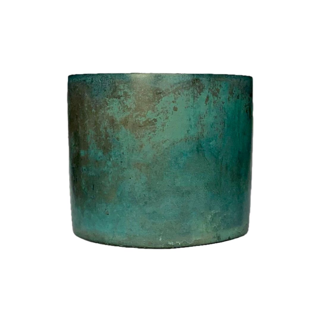 A handcrafted cement vessel in deep midnight tones with black and blue copper patinas, filled with natural, unscented soy wax.