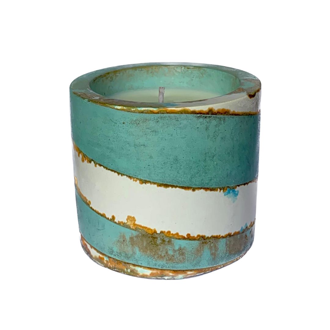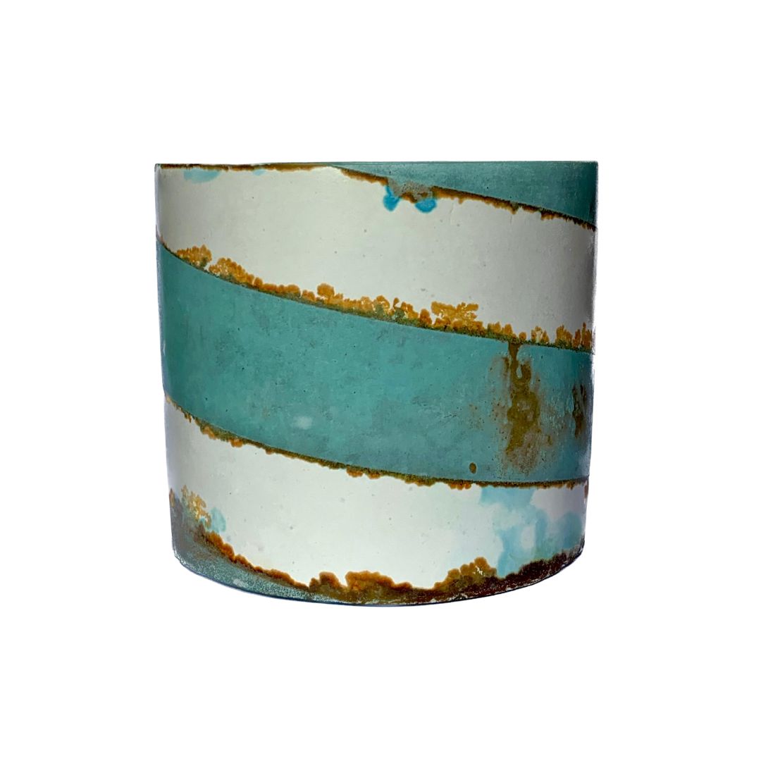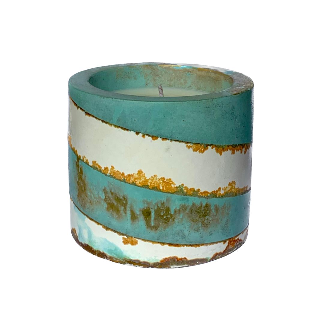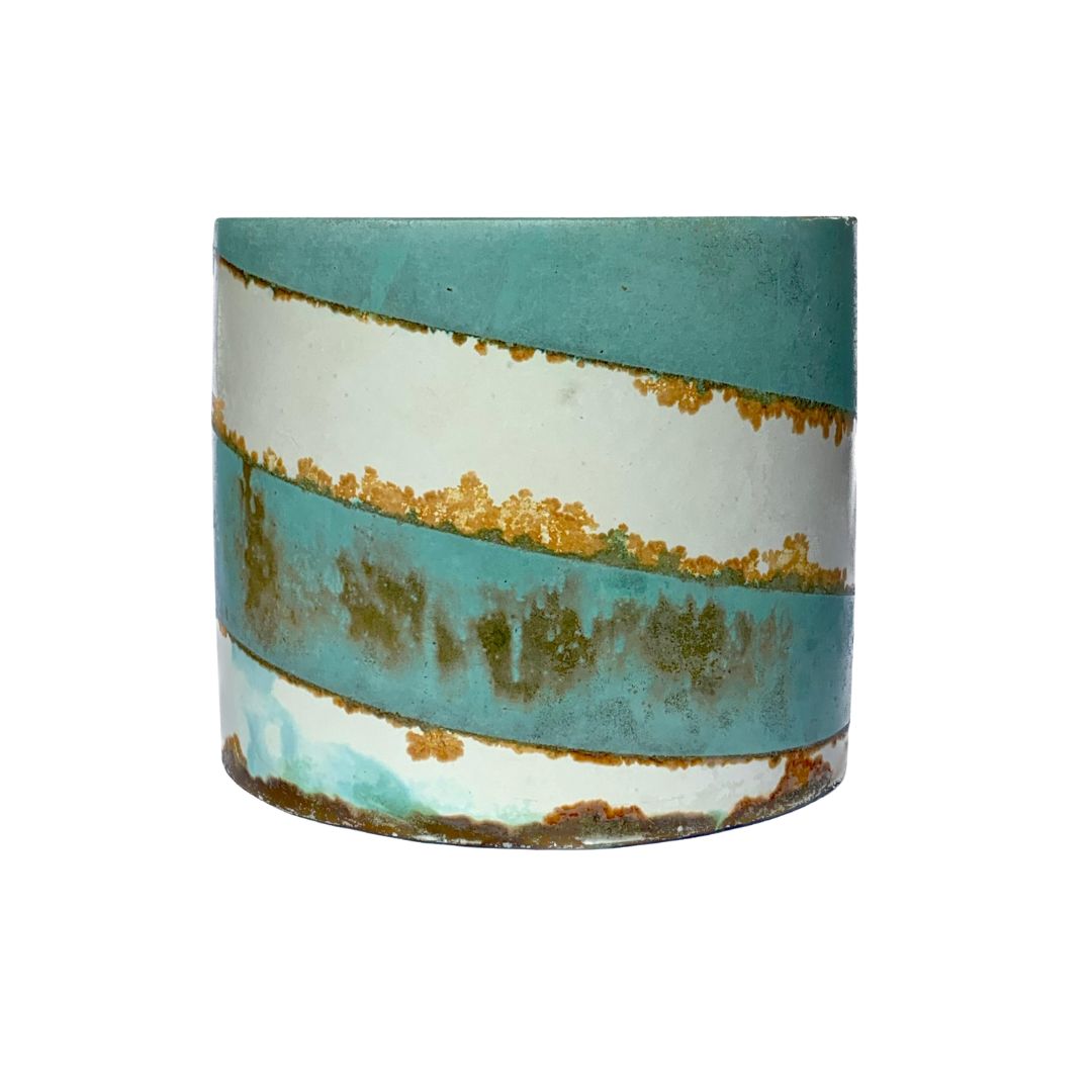 A cement vessel featuring a striking copper and iron patina that forms a rising spiral, symbolising movement. Filled with natural, unscented soy wax, offering a clean, burn and a modern, artistic touch to any space. Reusable and one of a kind.