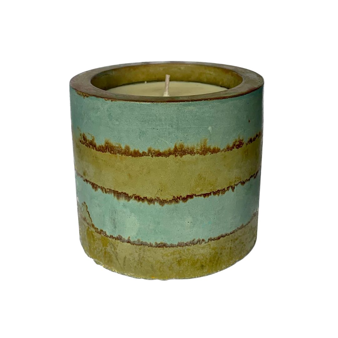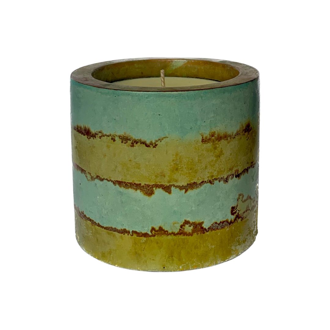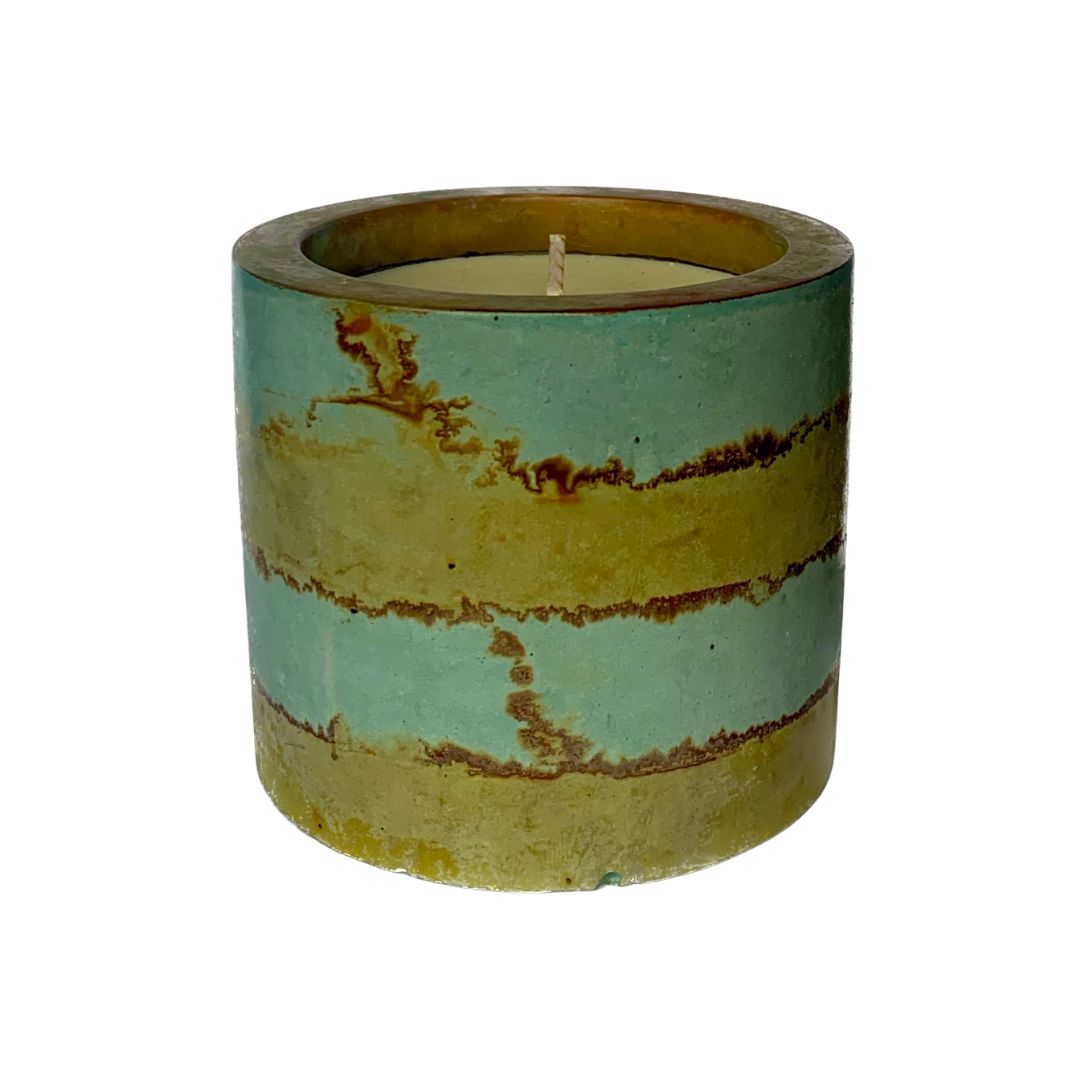 This handcrafted cement candle features a striking copper and iron patina, resembling organic rings of vibration.