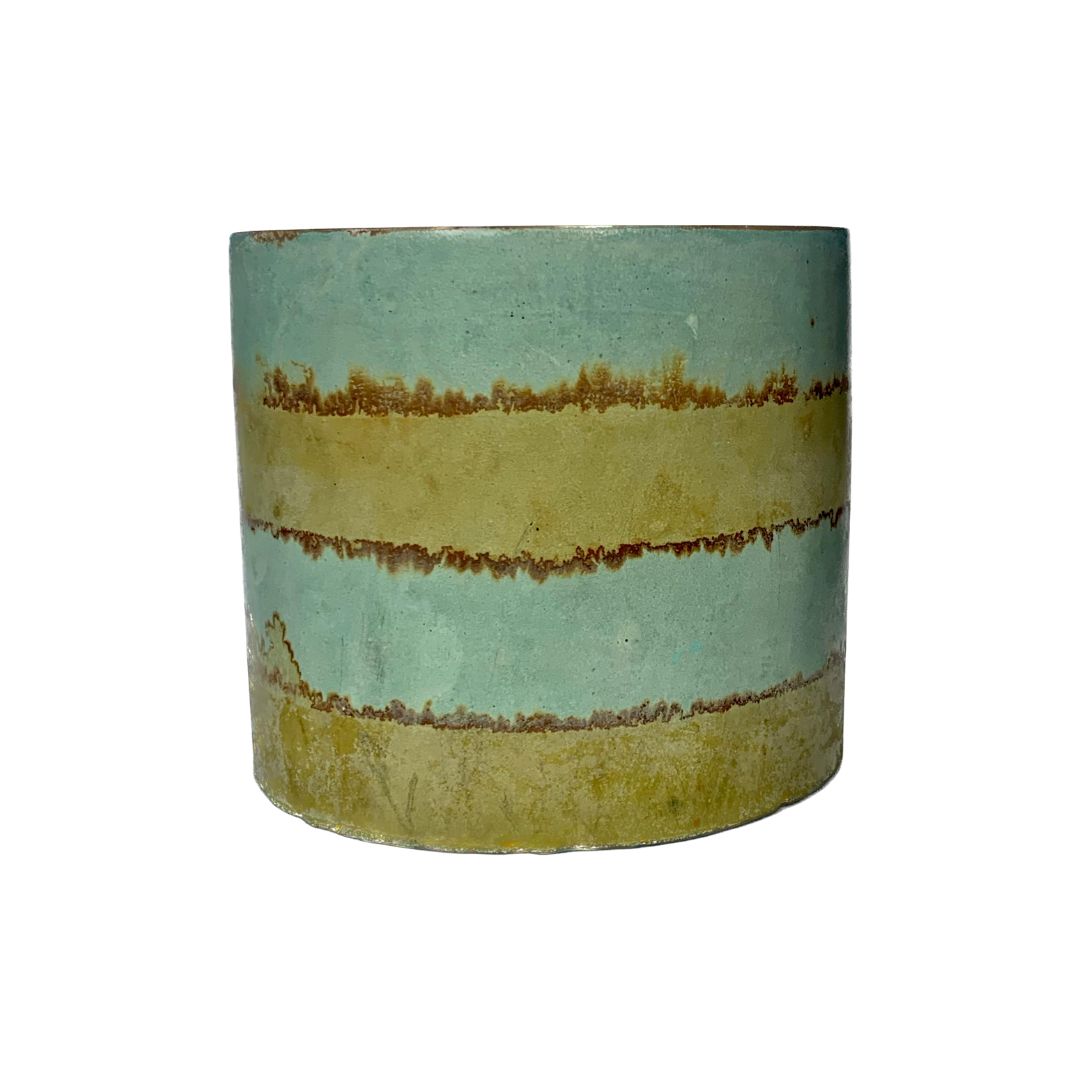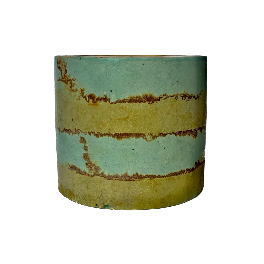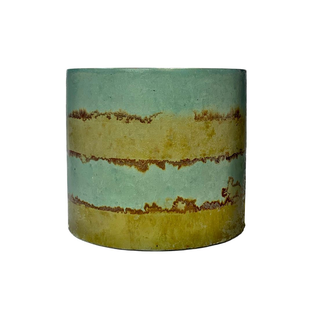 This handcrafted cement candle features a striking copper and iron patina, resembling organic rings of vibration.